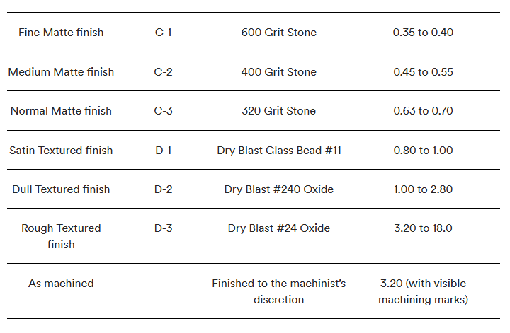 Denne tabel indeholder alle de SPI sprøjtestøbte overfladefinisher, vi tilbyder.